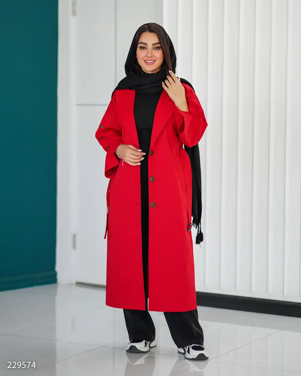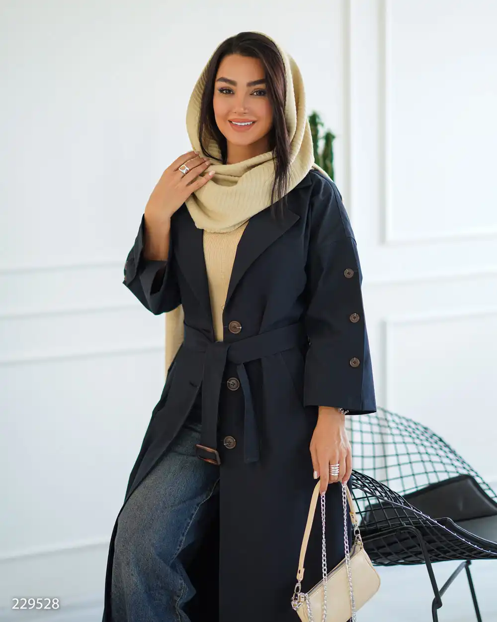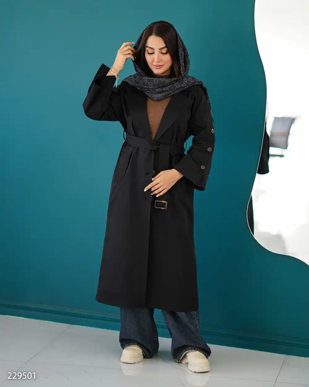 بارانی کتان tc روی آستین دکمه نما پشت چاکدار کمربنددار مدل پریوا دارای سه سایز و چند رنگ