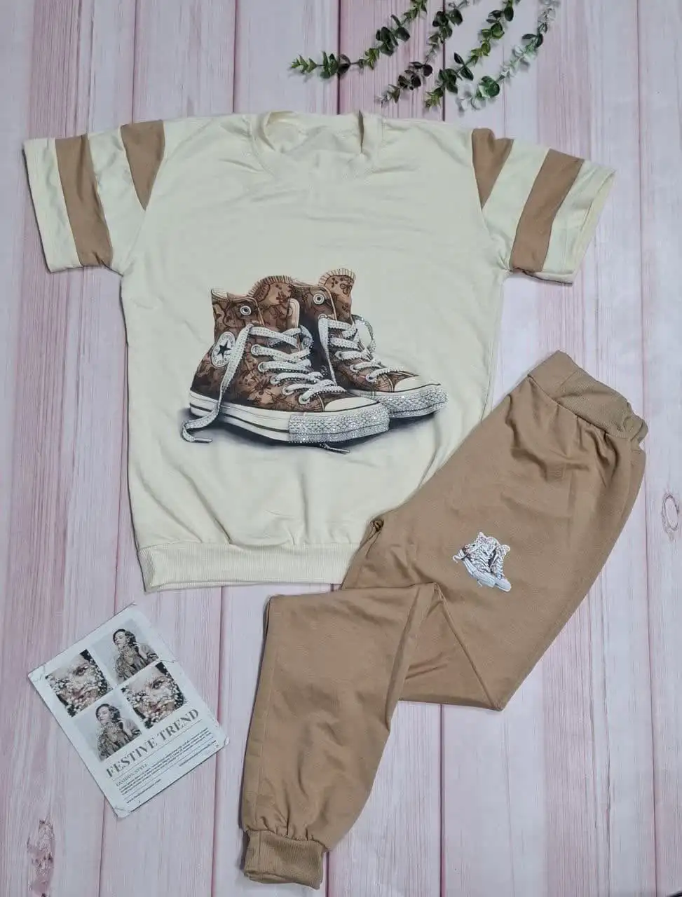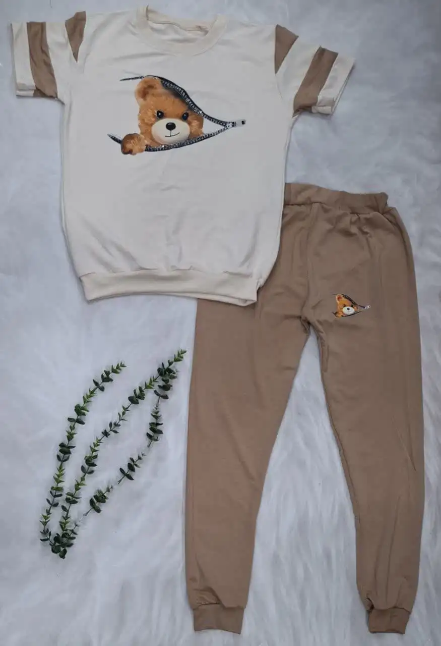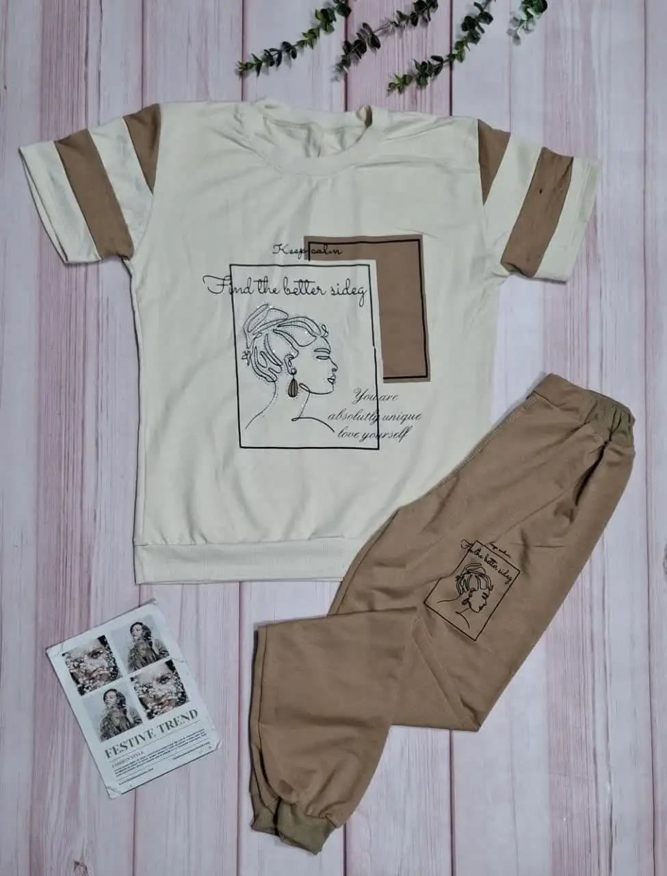 تیشرت شلوار کرم نسکافه ای زنانه/دخترانه مدل نوشا کد 117